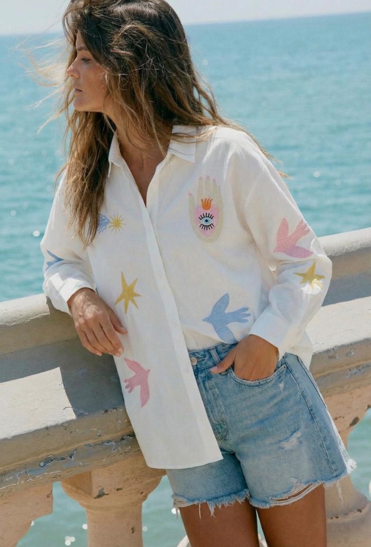 Heerlijke zomerse katoenen blouse met borduursels van duif, ster en een hamsa hand.